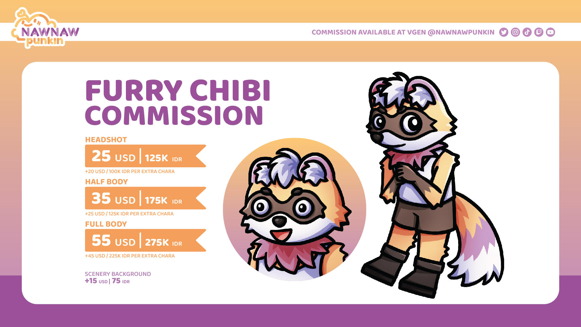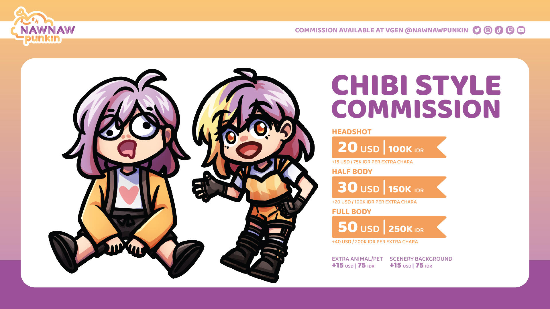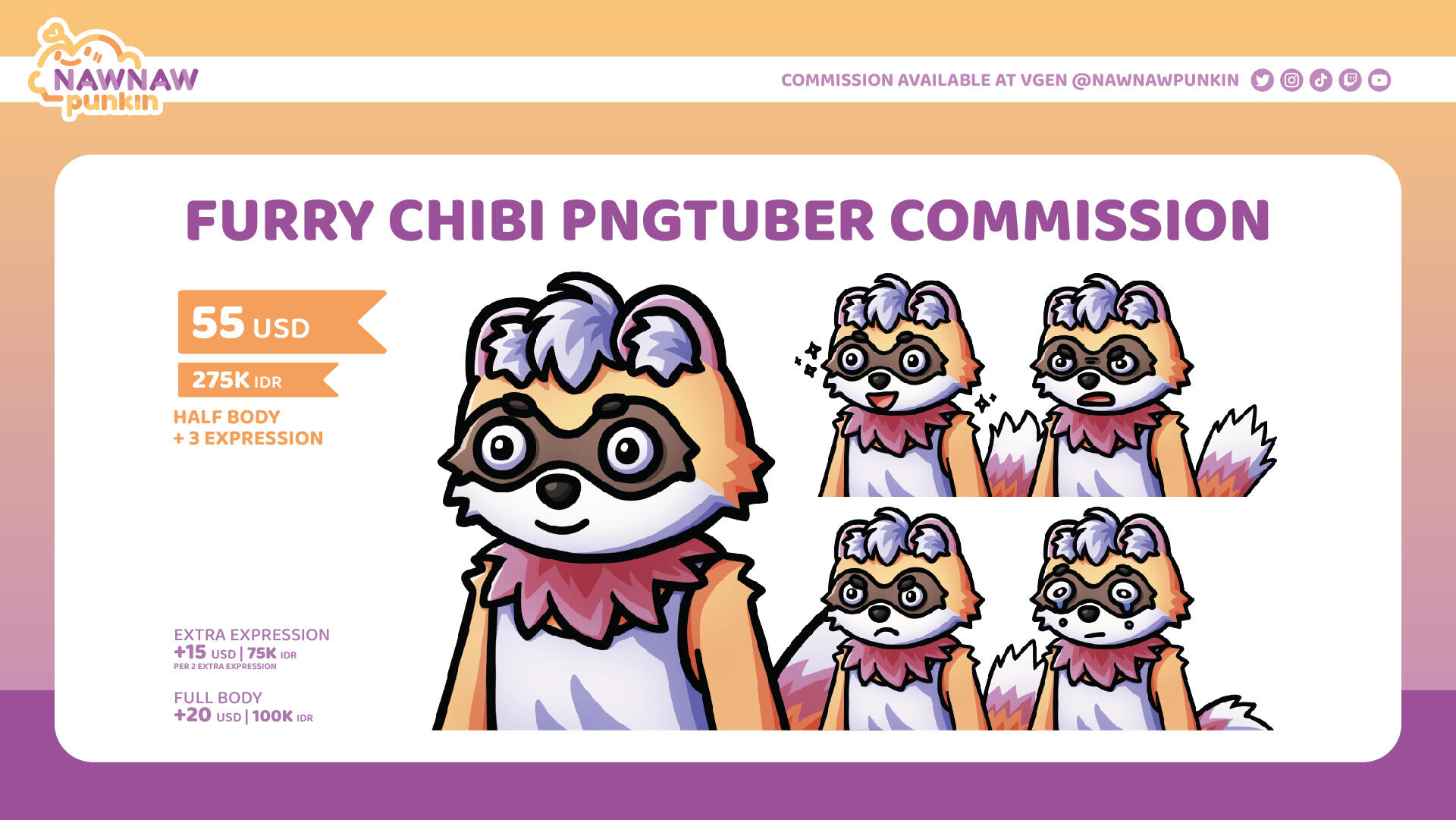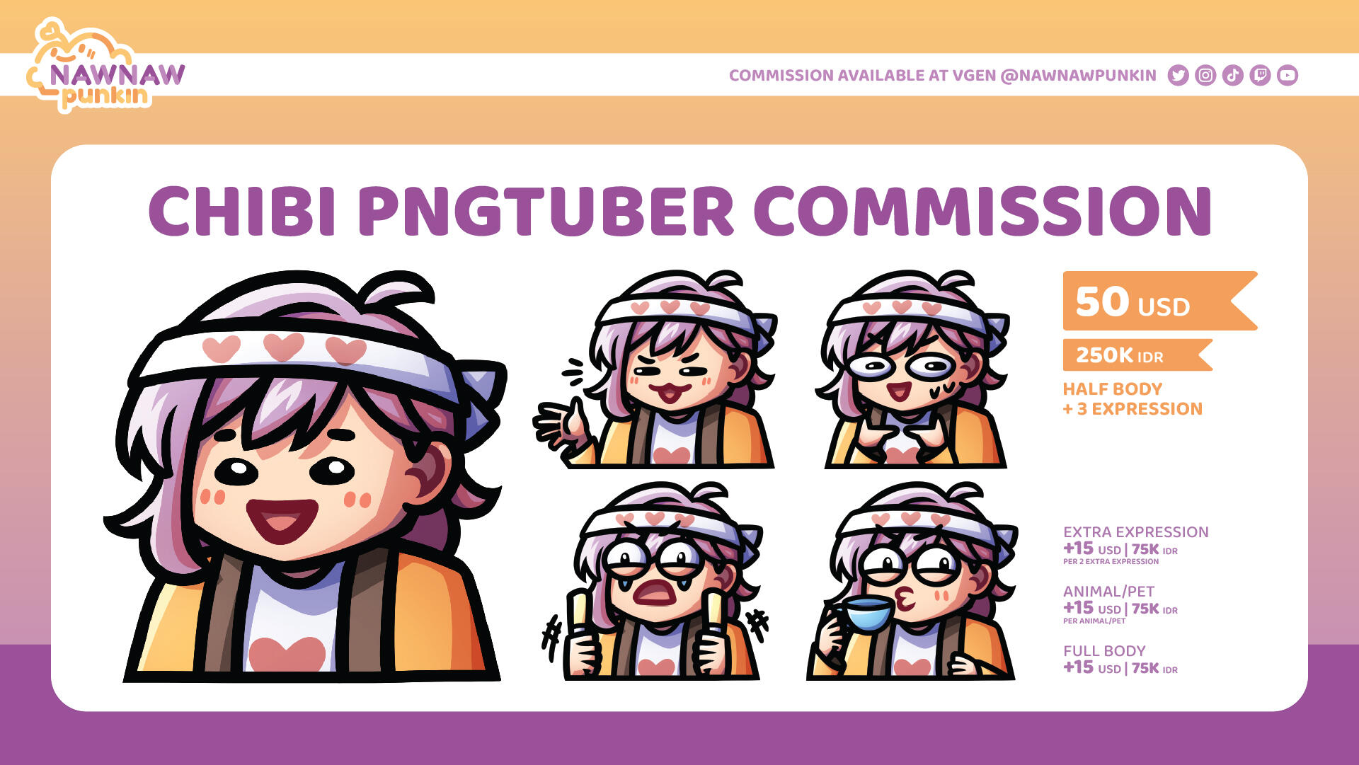 | Half Body + 3 Expression | 55 USD | 275K IDR |